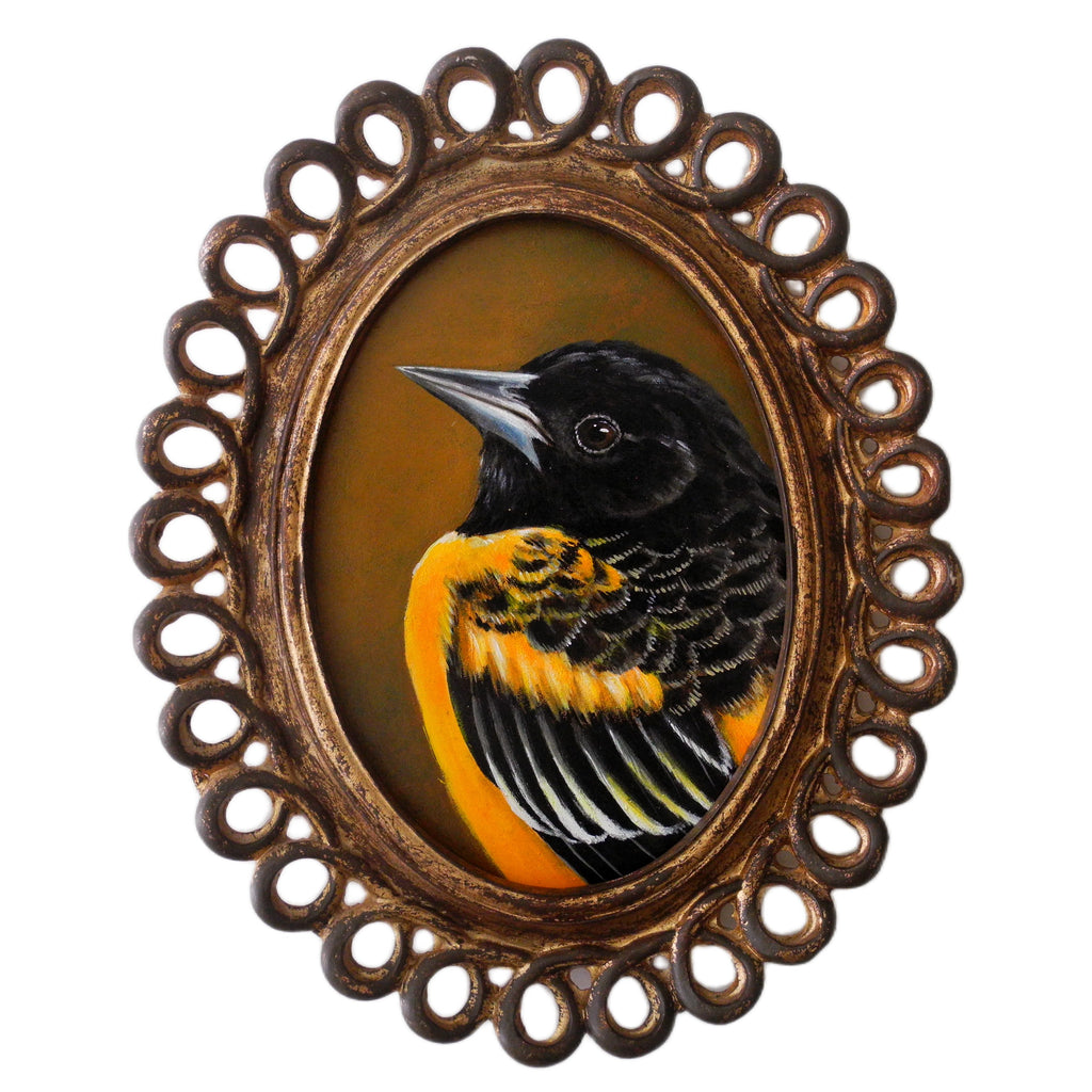 Baltimore Oriole in bold oranges and black.  This songbird poses on a russet background in a unique bronze-toned oval frame.