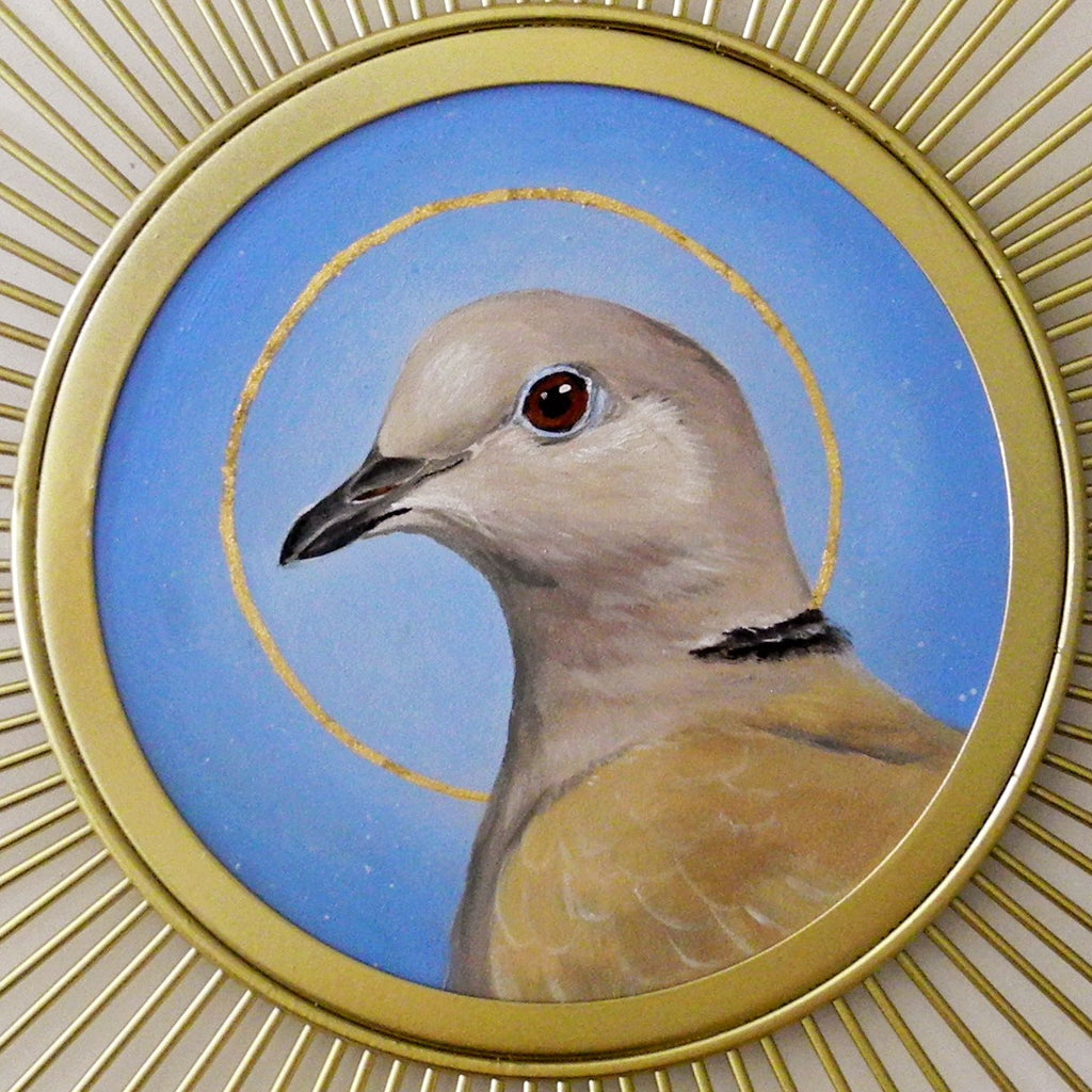 Original painted portrait of a Collared Dove on blue background with gold leaf halo. Set in a round gold sunburst frame.