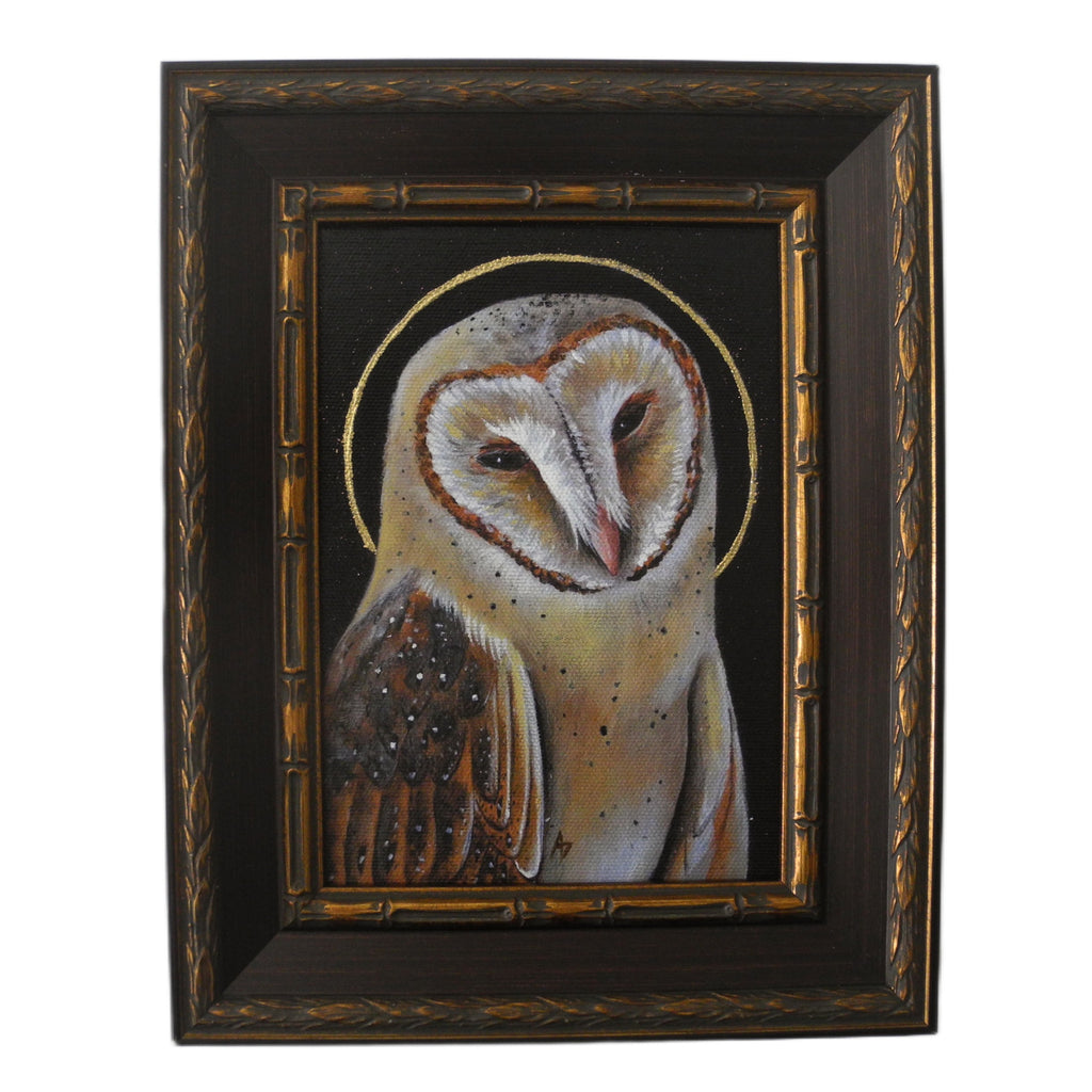 Barn Owl with gold leaf halo.  This piece has an antique feel, with rich subdued warm neutrals. Set in a faux wood frame with gold patina scrollwork and brown velvet backing.