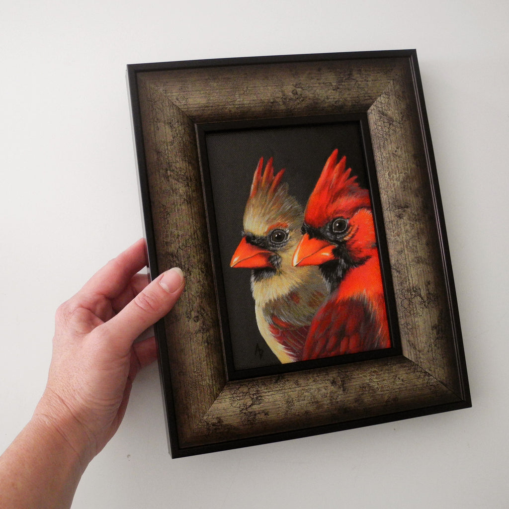 Pair of Cardinals in vivid reds and rich neutrals, larger than life on an ebony background. Set in a black composite frame with muted metallics and velvet backing.