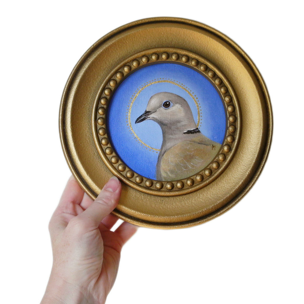 Collared Dove with gold leaf halo on blue ombre background. Set in a round gold frame.