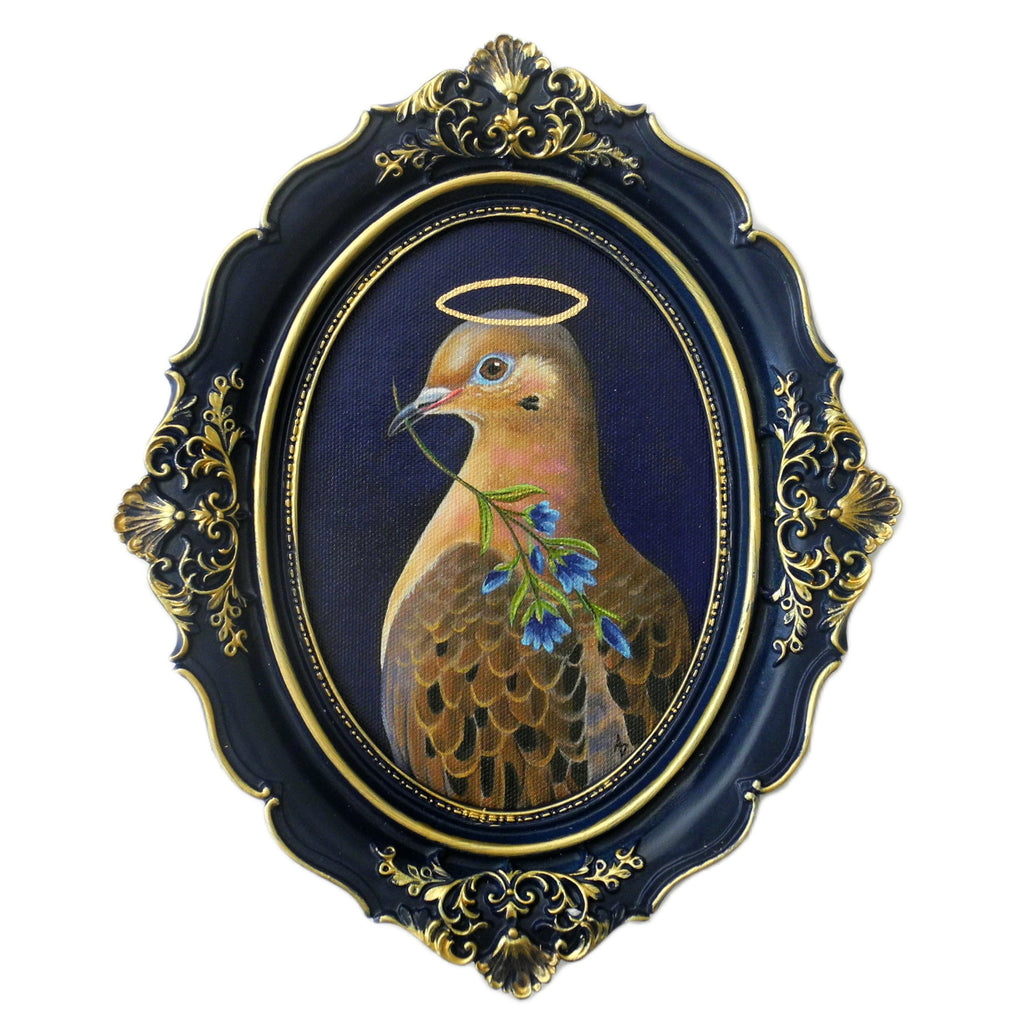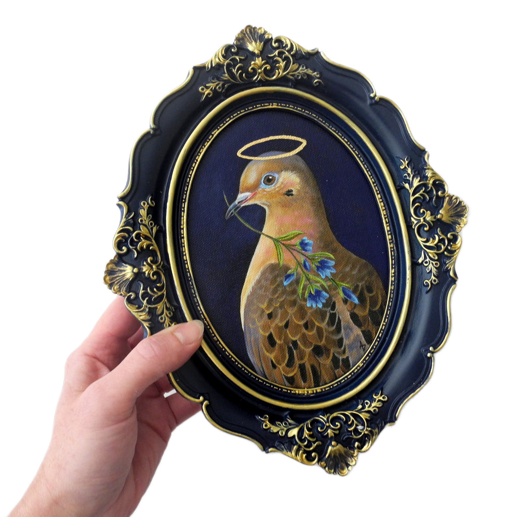 A Mourning Dove gazes at the viewer with delicate gold leaf halo, holding a sprig of lotus-inspired blue flowers. Set against a deep blue sky in an ornate blue and gold frame.
