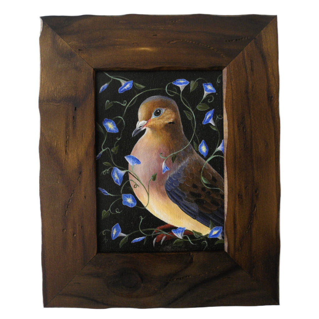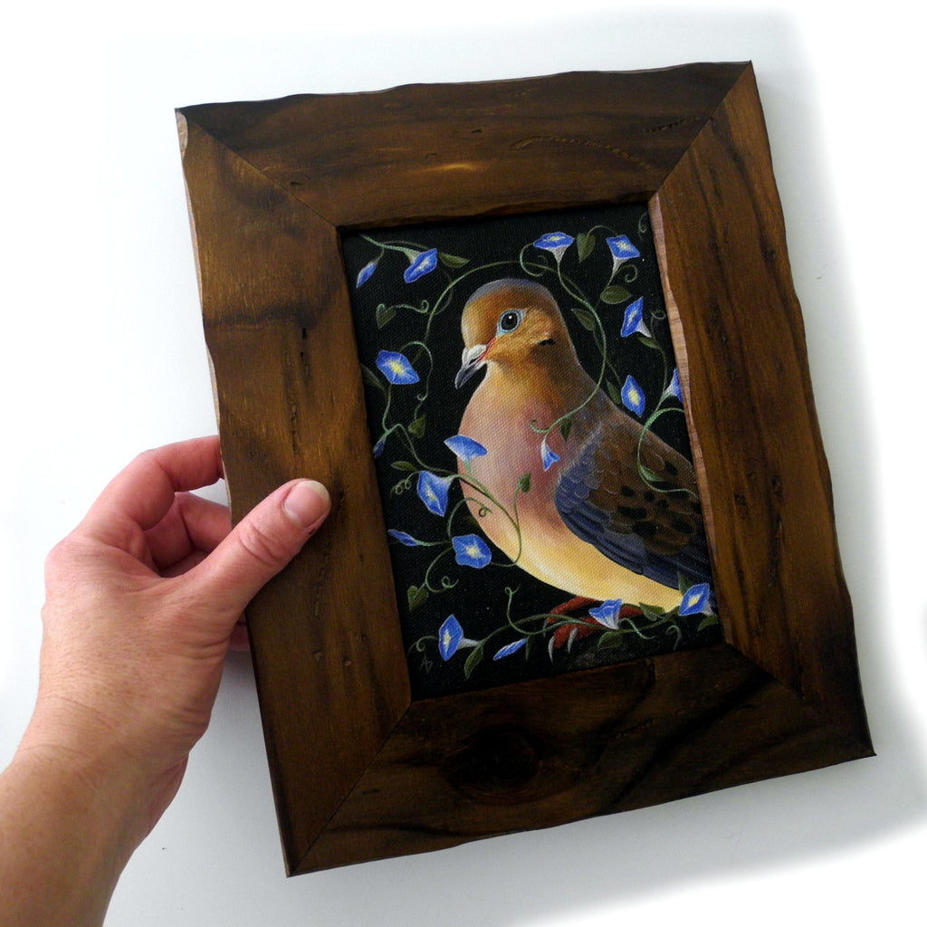 A solemn Mourning Dove gazes at the viewer from amongst vines of bright blue Morning Glories. This piece is a meditation on loss and the memory of loved ones - how connections remain intertwined regardless of time or distance. Set in a rustic wood frame with blue velvet backing.
