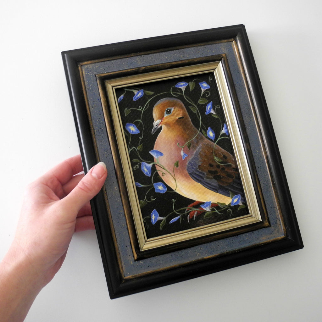 A solemn Mourning Dove gazes at the viewer from amongst vines of bright blue Morning Glories. This piece is a meditation on loss and the memory of loved ones - how connections remain intertwined regardless of time or distance. Set in a black wood frame with blue and gold accents.
