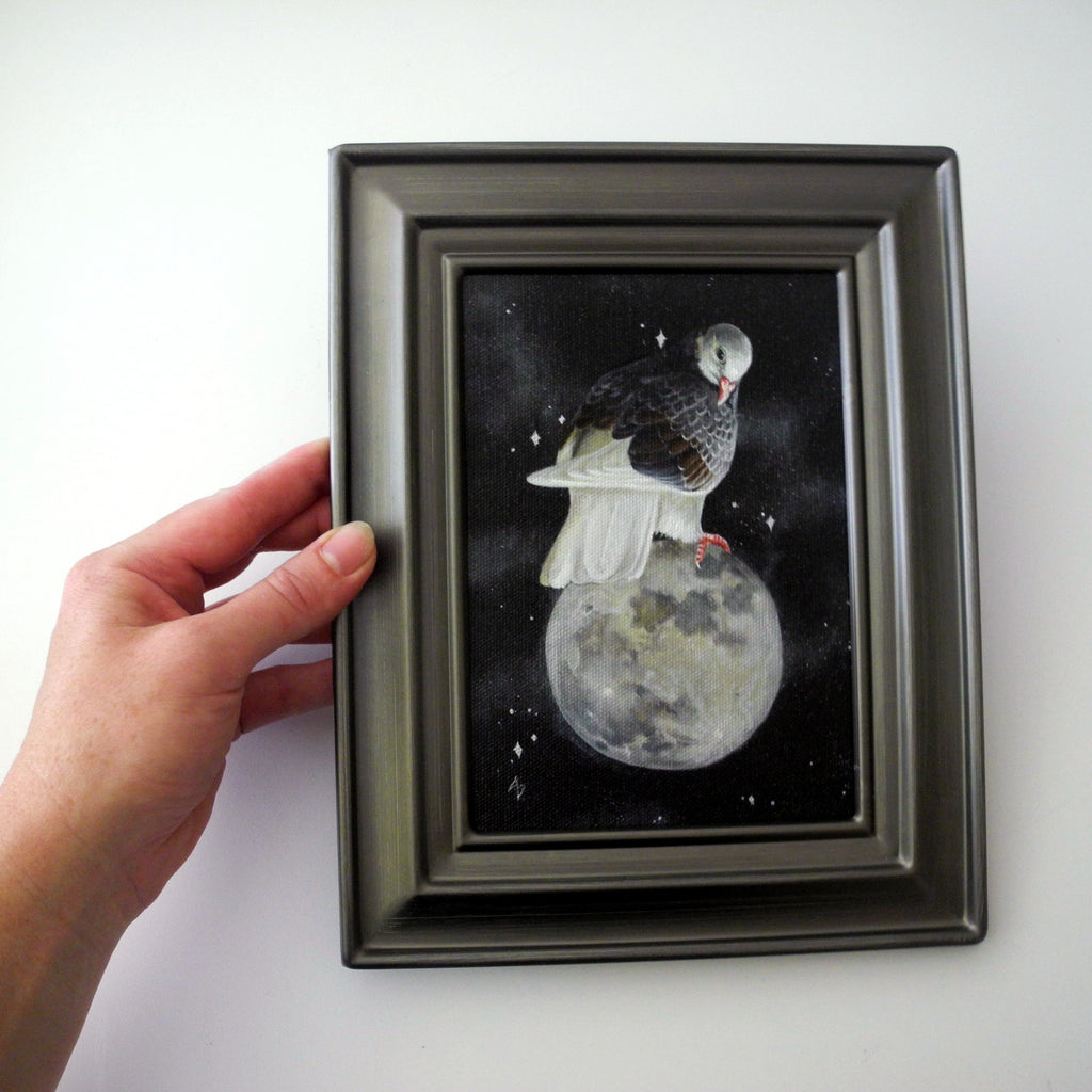 A pigeon perches atop the moon, in a night sky with stars. Set in a gunmetal gray frame - metal with velvet backing.