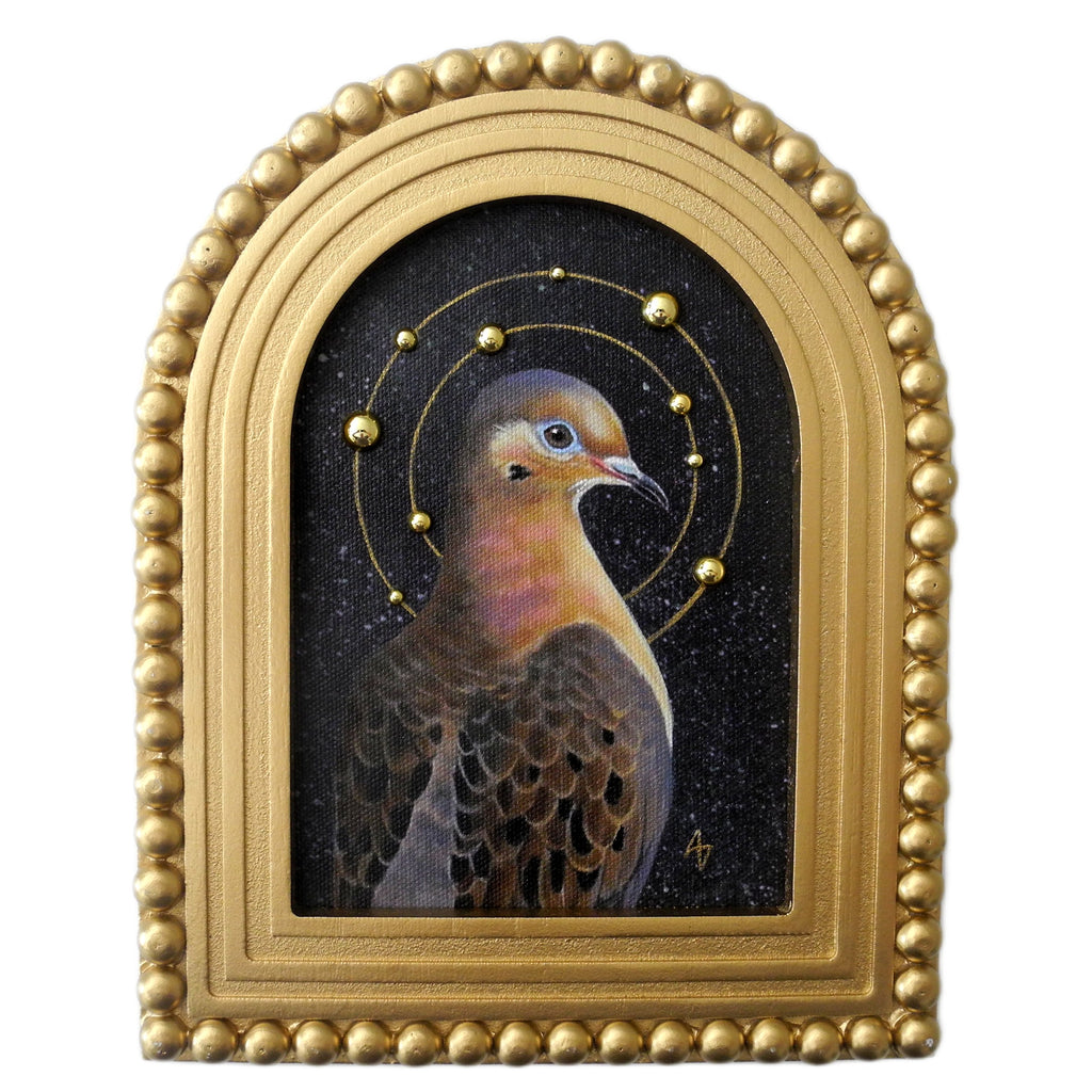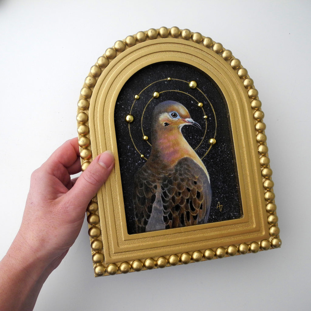 Mourning Dove with double halo of floating gold 3-D orbs, set against a starry night sky. Set in a gold frame with beaded trim.
