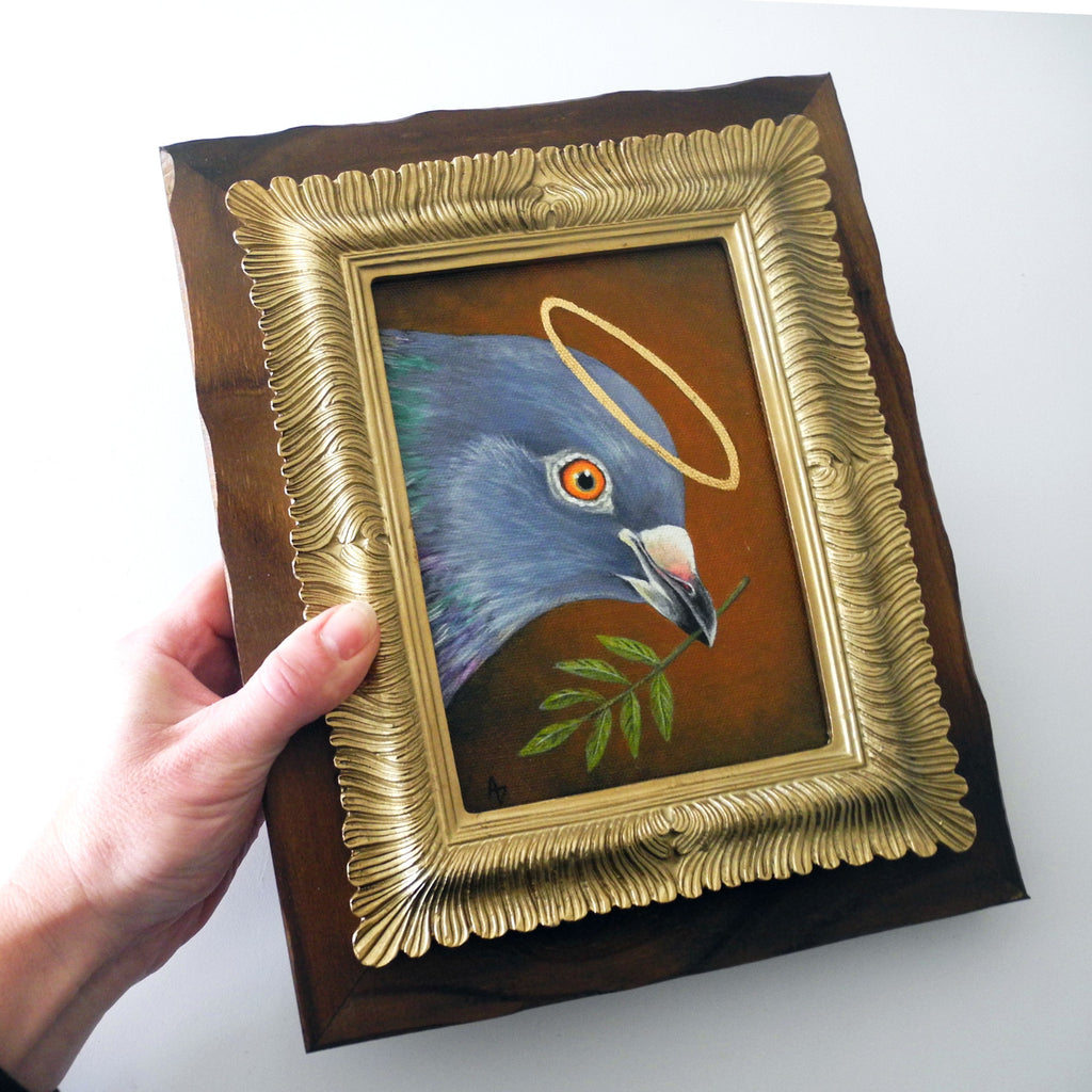 Pigeon saint with gold leaf halo, grasping a sprig of greenery. This piece has a russet orange background and is set in a gold and rustic wood frame.
