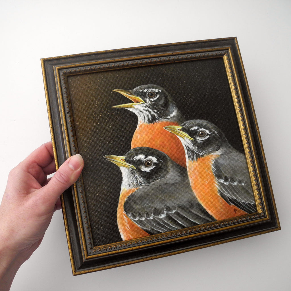 Three Graces, a portrait of a trio or Robins looking toward the light on a sepia backdrop. Set in a square frame with gold accents.