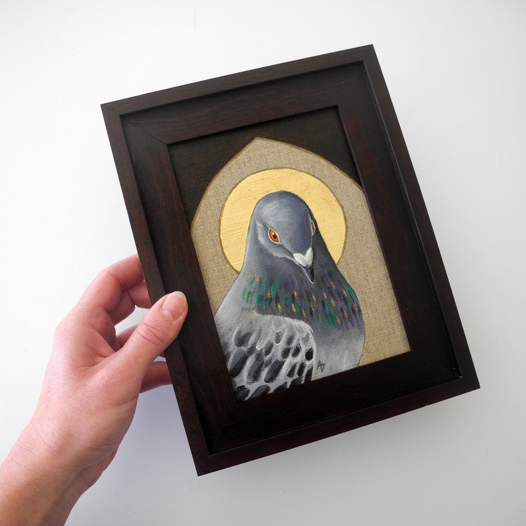 Pigeon saint portrait inspired by Medieval style, illuminated with gold leafing. This painting on rustic linen features blue-gray shading and feathers illustrated with linework and patterned mark-making. Set in a dark-stained wood frame with velvet backing.